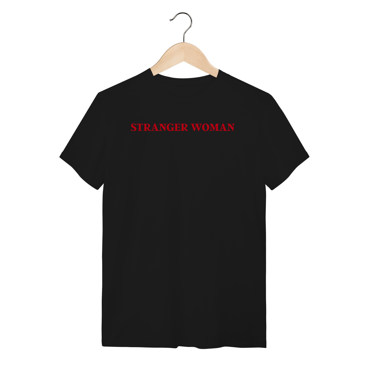 A Camiseta Stranger Woman se destaca pelo design minimalista em vermelho sobre o fundo preto, criando um contraste moderno e cheio de presença.