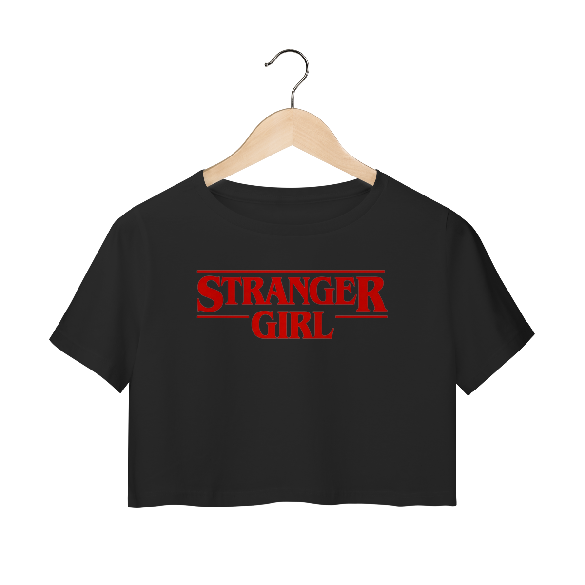O Cropped Stranger Girl se destaca pelo design minimalista em vermelho sobre o fundo preto, criando um contraste moderno, jovem e cheio de presença.